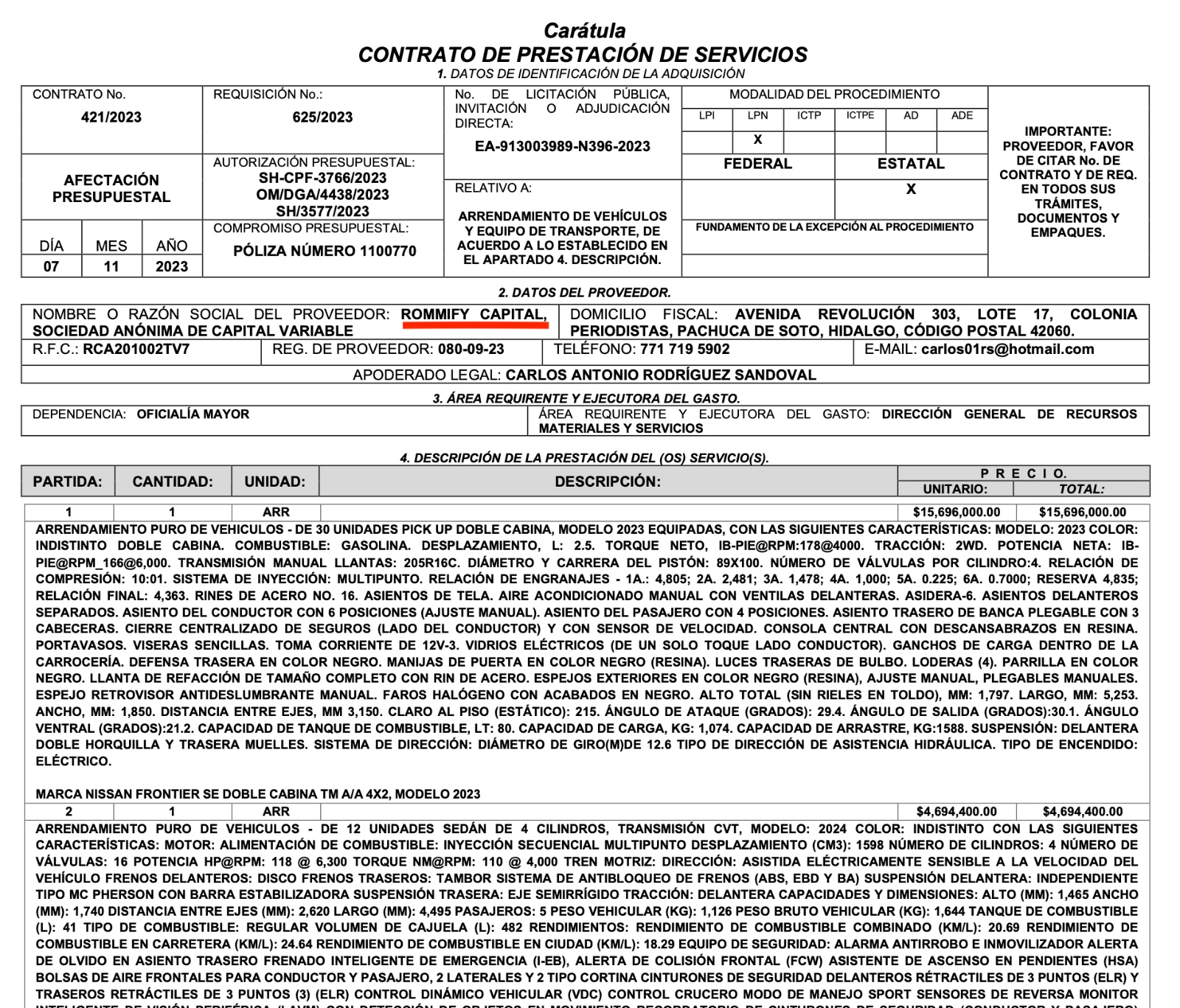Recientemente firmó el contrato PMMR-SA-026-FORTAMUN-2025, 2 de julio de 2025, para el arrendamiento de patrullas en el municipio de Mineral de la Reforma por un monto de $13,777,737.60 pesos; en el DIF Estatal obtuvo el contrato DIF/DAJ/0120/2025, enero de 2025, para el arrendamiento de vehículos y equipo de transporte 2025-2026 por un monto de $26,352,339.78 pesos; el contrato 034/2025, del 7 de abril 2025, para el arrendamiento 58 camionetas pick up, modelo 2025, por un monto de $23,100,184.32 pesos; el contrato 033/2025, firmado el mismo 7 de abril para el arrendamiento de vehículos por un monto de $12,550,692.38 pesos.