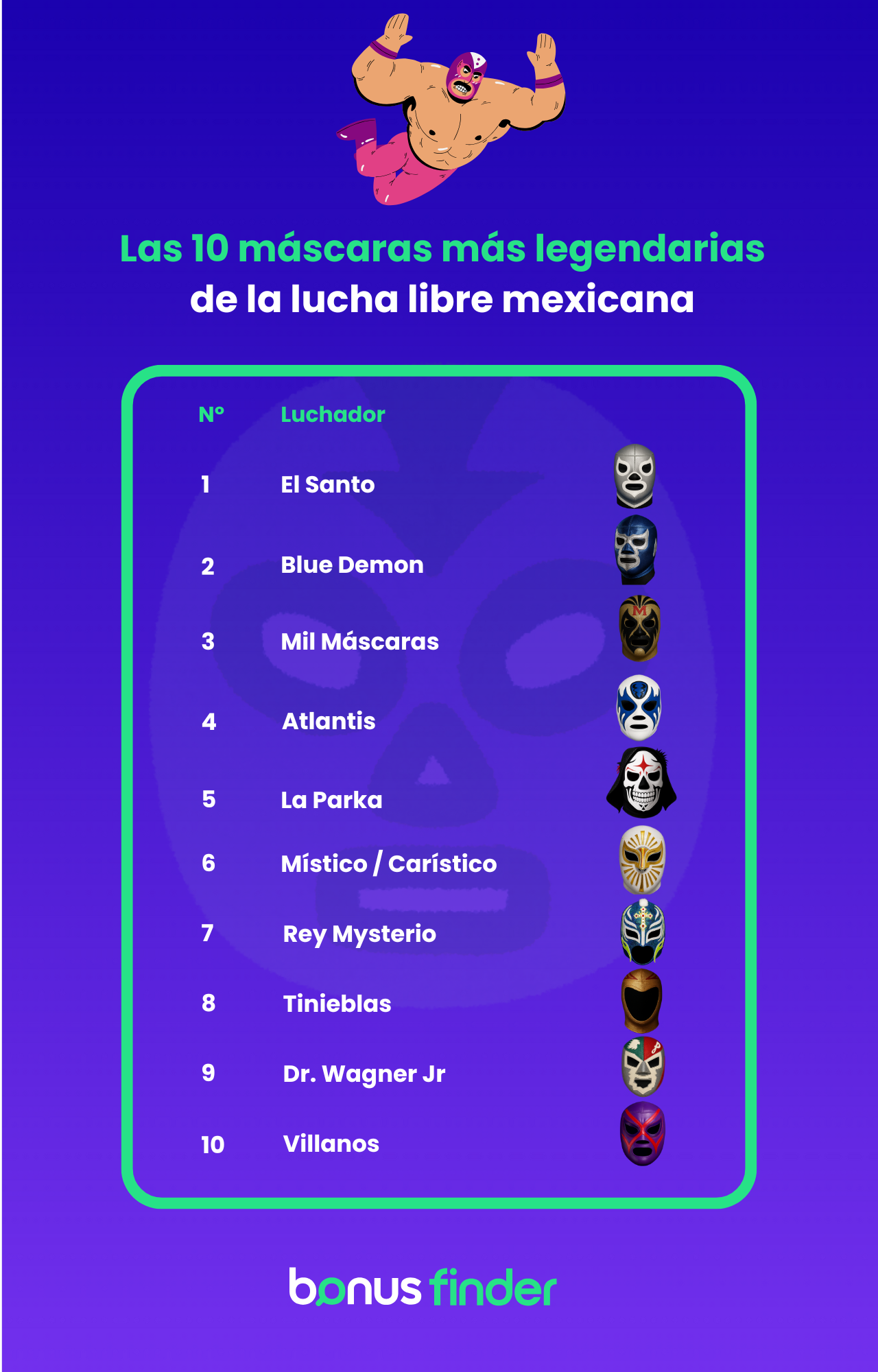 En México, la lucha libre no es solo un deporte: es un ritual, una tradición que se vive con pasión desde las gradas hasta los barrios populares. Las máscaras que portan los luchadores no son simples disfraces, sino símbolos de identidad, misterio y legado. Cada diseño encierra una historia, una personalidad y, en muchos casos, una leyenda que ha trascendido generaciones. Desde el plateado heroísmo de El Santo hasta la calavera irreverente de La Parka, estas máscaras han marcado la cultura popular mexicana como pocas expresiones lo han hecho. En BonusFinder han llevado a cabo un análisis de las 20 máscaras más populares de la historia de la lucha libre mexicana.
